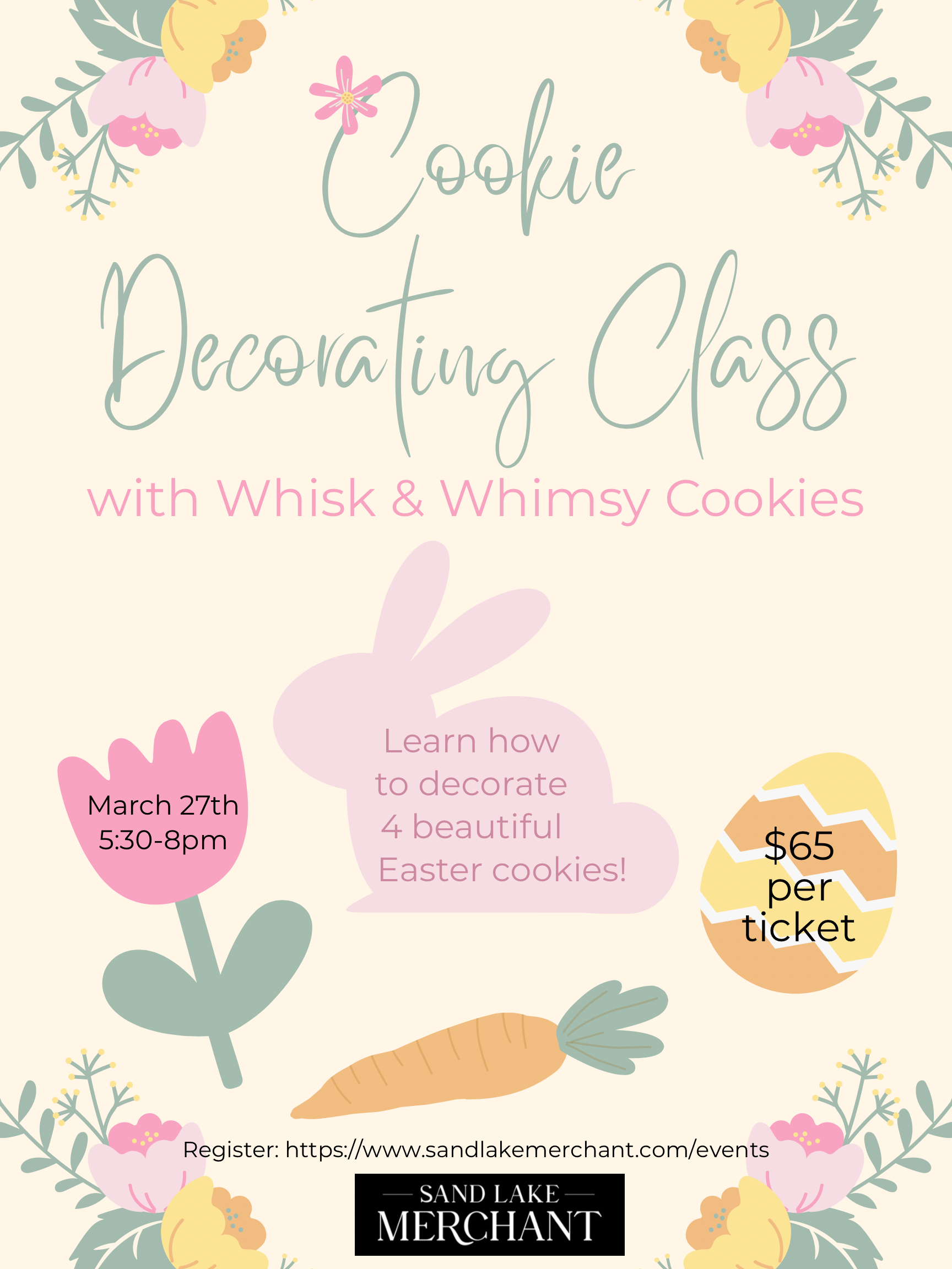 Friday, March 27th, 2026-Cookie Decorating with Whisk & Whimsy Cookies 5:30pm-8pm